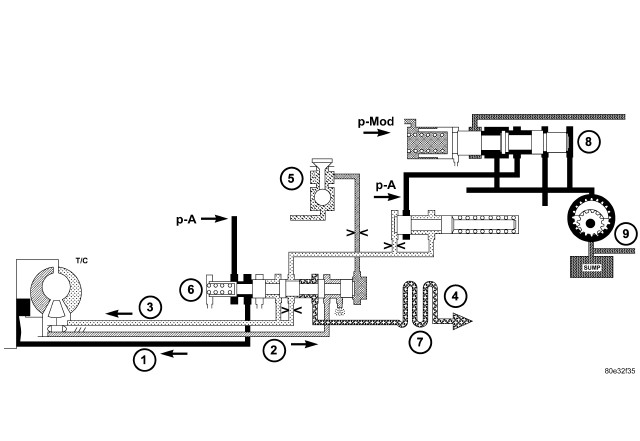 At the working pressure regulating valve surplus oil is diverted to the lubrication pressure regulating valve, from where it is used in regulated amounts to lubricate and cool the mechanical transmission components and the torque converter. Furthermore, the lubrication pressure (p-Sm) is also used to limit the pressure in the torque converter.