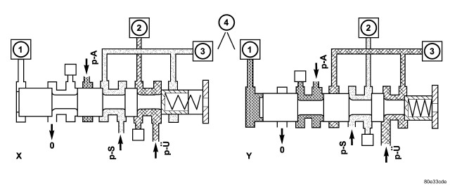 The regulating valve pressure is regulated at the regulating valve pressure regulating valve in relation to the working pressure (p-A) up to a maximum pressure of 8 bar (116 psi). It supplies the modulating pressure regulating solenoid valve, the shift pressure regulating solenoid valve and the shift valve pressure regulating valve.