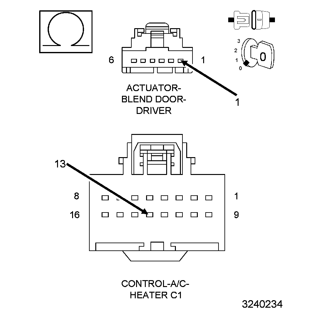 After the initial installation of the A/C Heater Control, the controller is calibrated to each individual blend/mode door actuator. These calibrations are stored as in the number of pulses it takes to move the door from one stop to another. The A/C Heater Control drives the Door Actuators by the use of Door Driver circuit and a Common Door Driver circuit and monitors all door actuator pulses to detect door movement in both directions. Most of the door actuators share a common door driver circuit but each door actuator has its own unique driver circuit. Due to shared circuitry, similar Diagnostic Trouble Codes (DTCs) can set at the same time for multiple actuators depending upon the type of circuit malfunction, its location, and the direction the actuator is moving when the malfunction is present. For further information Blend Door Actuator - Operation.