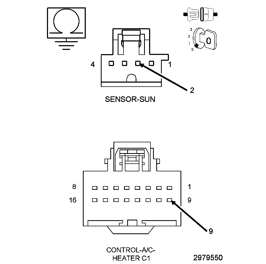 A sun sensor is not a thermistor type sensor but is more accurately a photo diode. For this reason the sun sensor responds to sun light intensity rather than temperature. The sun sensor converts sunlight intensity to an electrical voltage which provides data to the A/C heater control to help determine proper mode and blend-air door positions and blower motor speeds. The sun sensor assembly is also used to sense day and night conditions for automatic headlight control if equipped.