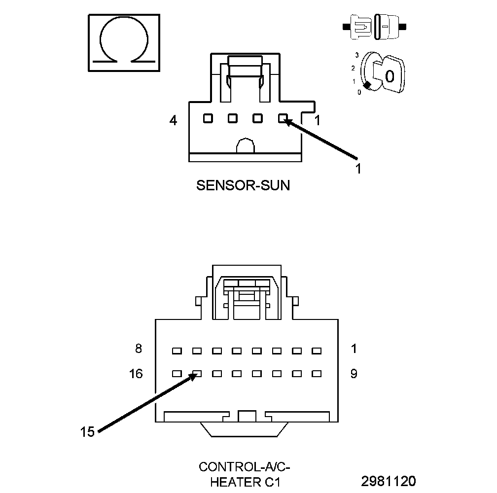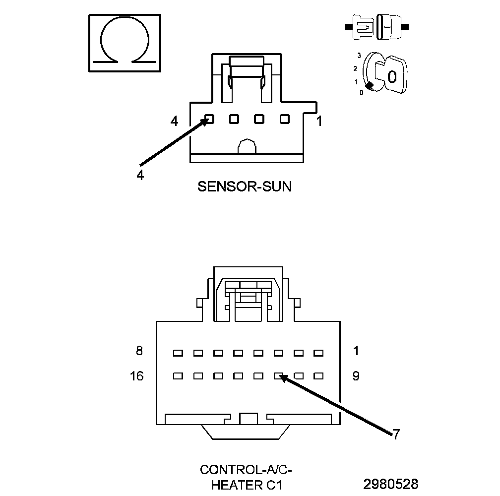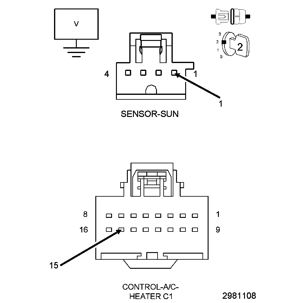A sun sensor is not thermistor type sensor but is more accurately a photo diode. For this reason the sun sensor responds to sun light intensity rather than temperature. The sun sensor converts sunlight intensity to an electrical voltage which provides data to the A/C heater control to help determine proper mode and blend-air door positions and blower motor speeds. The sun sensor assembly is also used to sense day and night conditions for automatic headlight control if equipped.