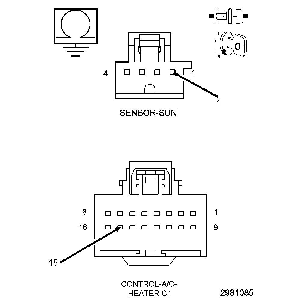 A sun sensor is not a thermistor type sensor but is more accurately a photo diode. For this reason the sun sensor responds to sun light intensity rather than temperature. The sun sensor converts sunlight intensity to an electrical voltage which provides data to the A/C heater control to help determine proper mode and blend-air door positions and blower motor speeds. The sun sensor assembly is also used to sense day and night conditions for automatic headlight control if equipped.