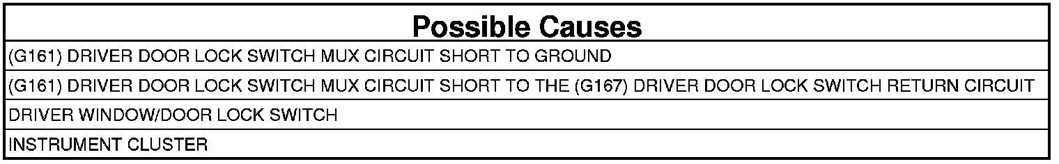 - Repair the (G161) Driver Door Lock Switch Mux circuit for a short to the (G167) Driver Door Lock Switch Return circuit.