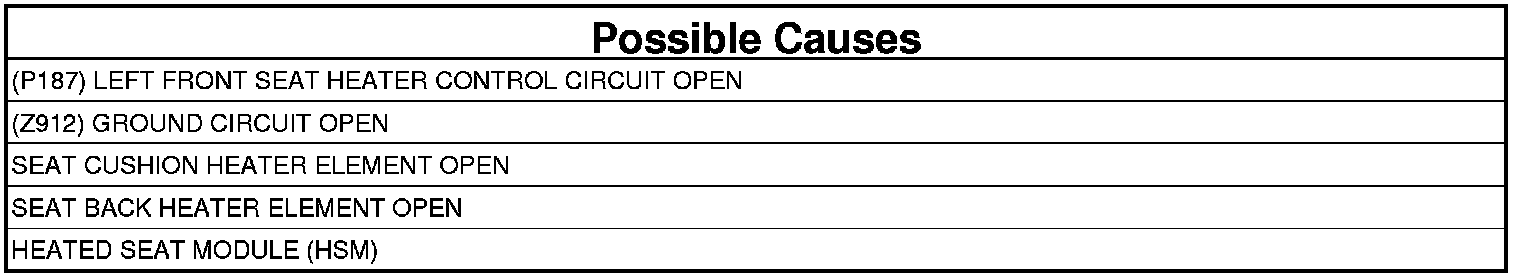 - Repair the (P187) Left Front Seat Heater Control circuit for an open.