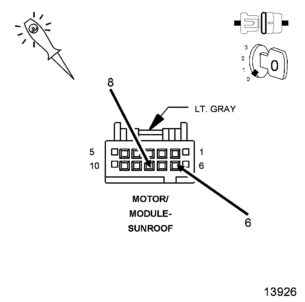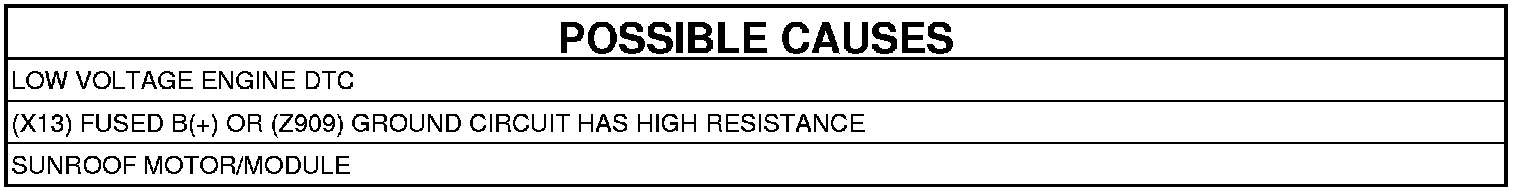 2. Test for a resisted (X13) Fused B(+) circuit by connecting a 12-volt test light between the (X13) Fused B(+) circuit and the (Z909) Ground circuit in the Sunroof Motor/Module connector. The test light must illuminate brightly. Compare the brightness to that of a direct connection to the battery.