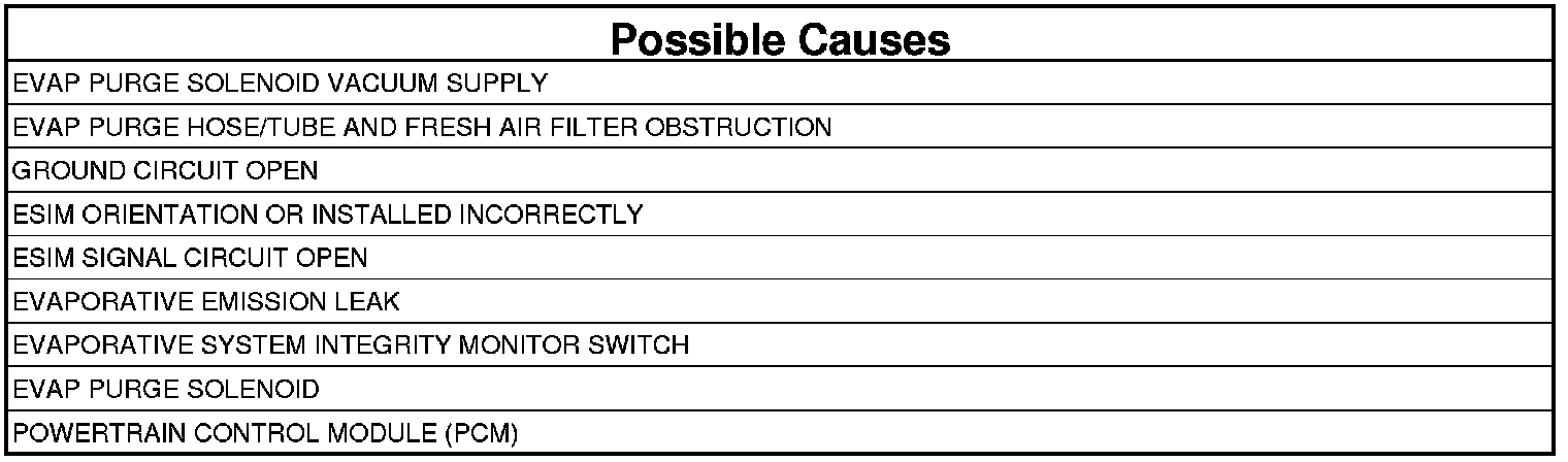 1. Using the wiring diagram/schematic as a guide, inspect the wiring and connectors between the Evap Purge Solenoid Assembly, Evaporative System Integrity Monitor (ESIM) Switch and the Powertrain Control Module (PCM).