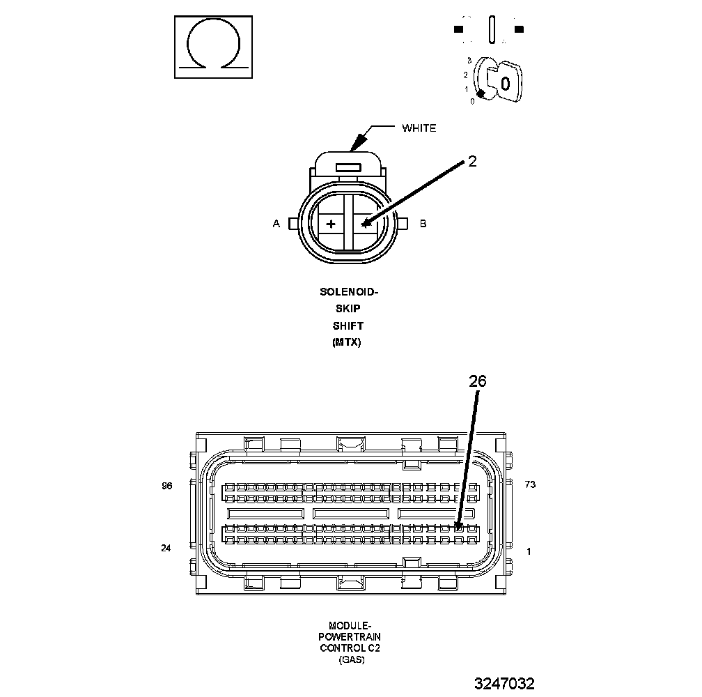 1. Using the wiring diagram/schematic as a guide, inspect the wiring and connectors between the Skip Shift Solenoid and the Powertrain Control Module (PCM).