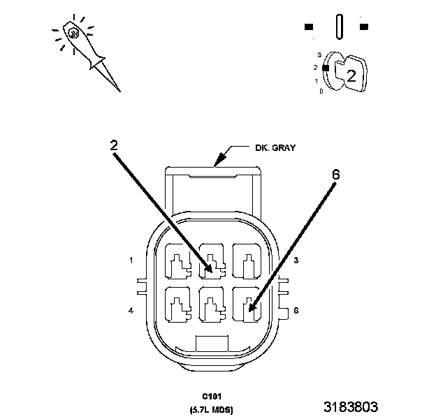 5. Using a 12-volt test light connected to the Ground circuit, probe the (K452) MDS Solenoid No.4 Control circuit in the C101 harness connector.