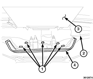 3. Using a trim stick or another suitable wide flat-bladed tool, carefully pry between the Center High Mounted Stop Lamp (CHMSL) (3) and the CHMSL cover (4). The CHMSL cover (4) is secured to the headliner by five stamped nuts (1). As you pry on the trim stick, carefully pull down on the sides of the CHMSL cover far enough to disengage the three snap clips that secure it to the inner rear roof header.