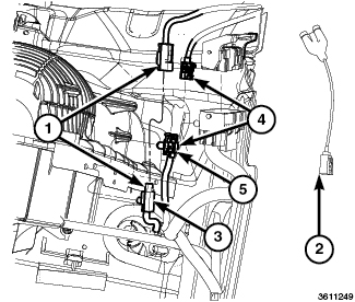 3. Connect the appropriate 50 Ohm test (9977-6-4) (1) or (9977-6-2) (1) to the Antenna cable (2) at the Antenna Module harness connector.