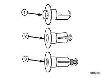 3. To remove the push pin fastener, push the center pin inward approximately 2 mm to release push pin fastener (3).