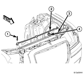 3. Engage the prop rod into the rod clip (4) on the left side of the headlamp mounting crossmember.