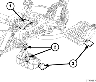 2. If equipped with non adjustable tailpipes, position the tailpipe/resonator (3) assembly in vehicle.