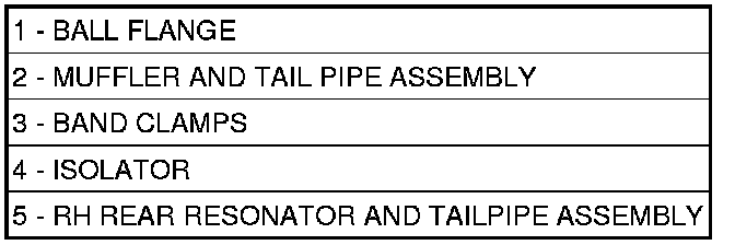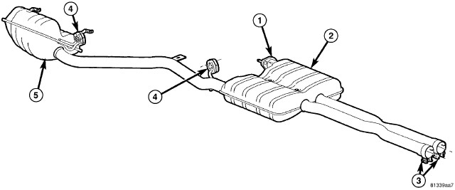 6. Remove the muffler and tailpipe assembly (5) by twisting/turning while pulling assembly out of catalytic converters.