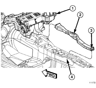 3. Install the retainer (3) that secures the floor console duct to the center floor panel (4).
