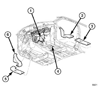 1. Install the driver side rear intermediate floor distribution duct (5) and the passenger side rear intermediate floor distribution duct (3) into the slots in the floor support (4).