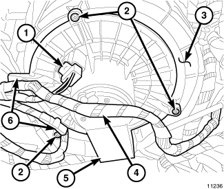 4. Engage the HVAC wire harness onto the two wire harness retainers (6).