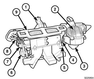 This vehicle is equipped with a HVAC housing (1) that combines heating, ventilation and A/C capabilities into a single unit, mounted within the passenger compartment, behind the instrument panel. The HVAC housing includes: