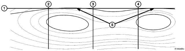 With the horizontal centerline of the headlamp (2) transferred on the wall, measure down 53 mm (2.1 in). This line (1) will be the vertical aiming mark. Using the left side of the headlamp vertical centerline (3), adjust the headlamp unit so the residual light from the headlamp, not the hot spot, is even with the line (1) that was marked previously 53 mm (2.1 in) below the horizontal centerline (2). The ideal alignment should be (5). The right headlamp aiming will be the same, but using the area left of right headlamp vertical centerline (not shown).