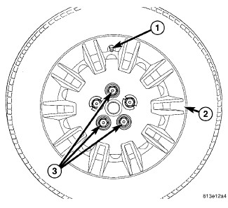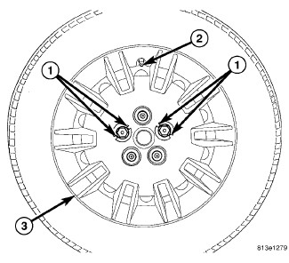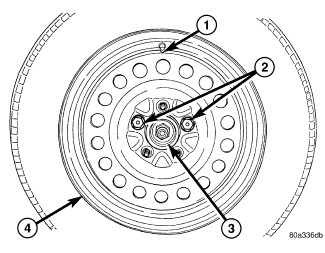 NOTE: Wheel mounting nuts must be installed on the studs as shown (2) to allow proper installation of the wheel cover.