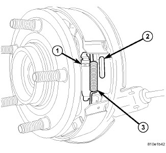 3. Install parking brake shoe adjuster (1) between upper and lower parking brake shoes. Position end of adjuster with star wheel upward. Once in place, slide upper shoe downward against adjuster mounting slot, taking up any slack between two pieces.