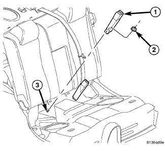 1. Position the rear seat belt buckle onto mounting studs (3).