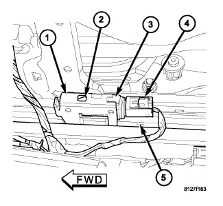 1. Reach under the front seat cushion to position the seat track position sensor (3) to the open end of the bracket (1) located on the inboard side of the lower outboard seat track (5).