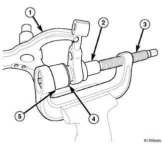 4. Position knuckle (1) over tools guiding top of ball joint inside of Installer (5) until outside flange of ball joint (4) comes into contact with Installer, then hand tighten Press screw-drive (3) until Remover (2) comes into contact with bottom of knuckle (1).