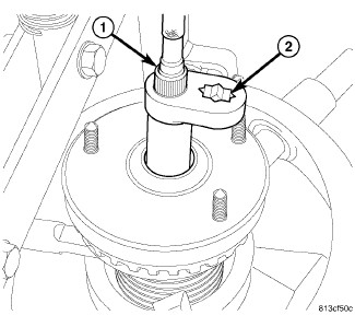 10. Install Strut Nut Wrench (2) (on end of a torque wrench), on shock shaft retaining nut. Next, insert 8 mm socket though Wrench onto hex located on end of shock shaft. While holding shock shaft from turning, tighten nut using Wrench to 90 Nm (66 ft. lbs.) torque.