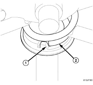 7. Install shock through bottom of coil spring until lower spring isolator (on shock) contacts lower end of coil spring. Match step built into isolator (1) to lower coil end (2).