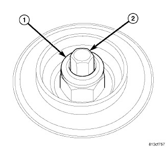 9. Install retaining nut (1) on shock shaft (2) as far as possible by hand. Make sure nut is installed far enough for 8 mm socket to grasp hex (2) on end of shaft for tightening.