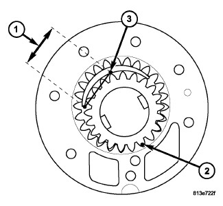 Tip clearance for the inner gear can be checked by moving the inner gear into tight mesh (2) (Figure 2) with the outer gear as shown. Clearance between the ID of the crescent feature of the housing and the OD of the teeth of the inner gear (3) should then me measured at a point 37 mm (1.45 in.) from the corner of the crescent (1) feature, as shown below.