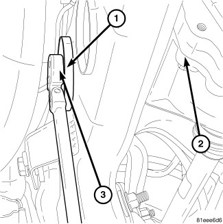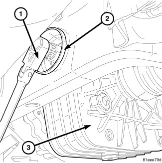 12. Remove rear axle fill plug (2). Fill axle with 1.2L (1.2 qts.) of Mopar(R) 75W-90 Synthetic Gear and Axle Lubricant and add one 0.03 L (4 oz.) bottle of MOPAR(R) Limited Slip Additive Friction Modifier. Install fill plug and torque to 35 Nm (25 ft. lbs.).
