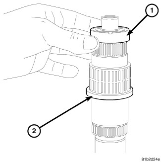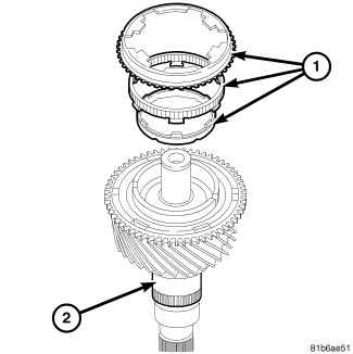 13. Install second gear synchronizer rings (1) on second gear (2).