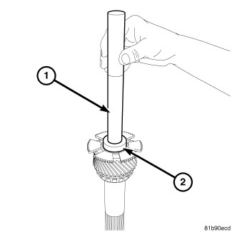 11. Install second gear bearing spacer (1) on mainshaft (2).