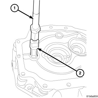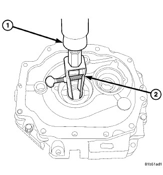 2. Remove shift rail bushing with Slide Hammer (1) and Remover (2).