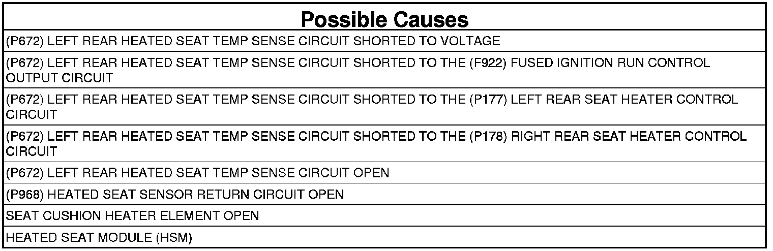 - Repair the (P672) Left Rear Heated Seat Temp Sense circuit for a short to voltage.