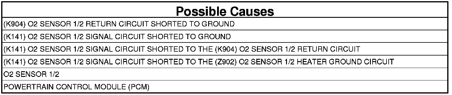 - Repair the short between the (K904) O2 Sensor 1/2 Return circuit and the (K141) O2 Sensor 1/2 Signal circuit.