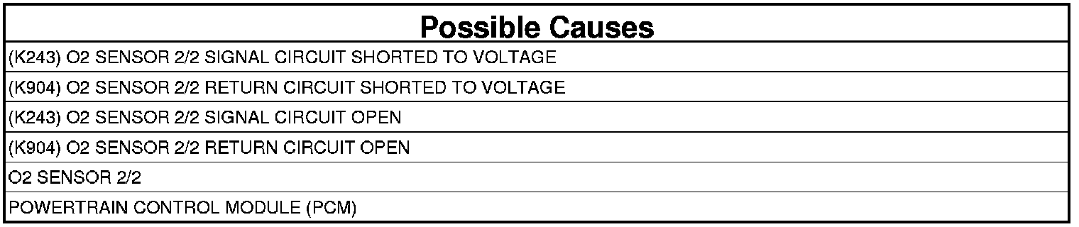 The Powertrain Control Module (PCM) detects that the Oxygen Sensor 2/2 voltage is greater than the maximum acceptable value for a specific amount of time, based on O2 sensor heater temperature. The DTC will set as Pending after one trip and Active after two trips. Three good trips to turn off the MIL.