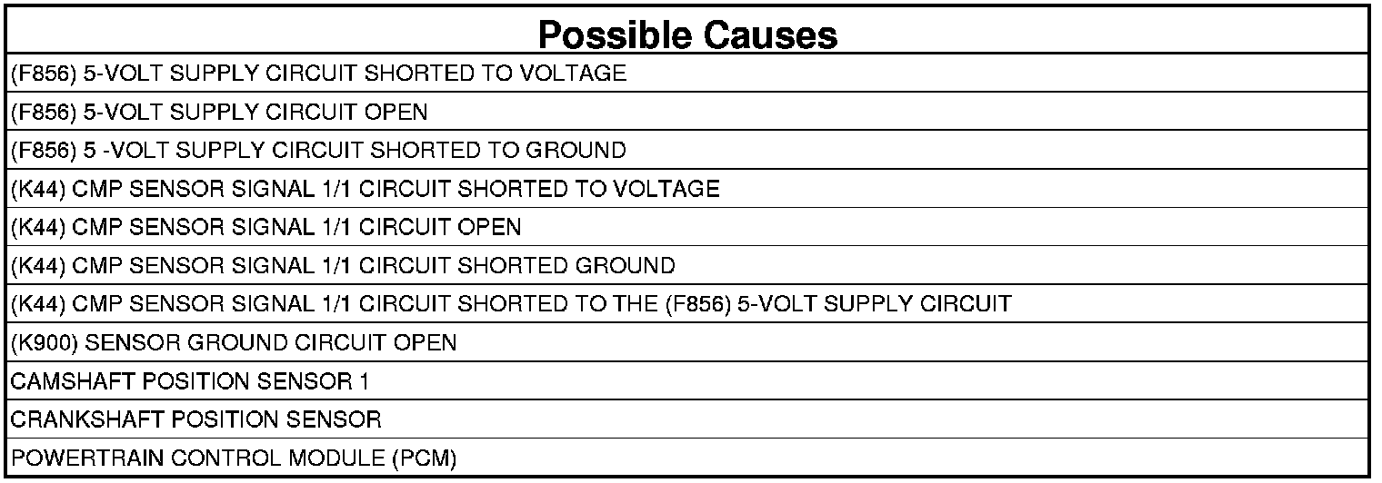 - Repair the short between the (K44) (K44) CMP Sensor Signal 1/1 circuit and the (F856) 5-Volt Supply circuit.