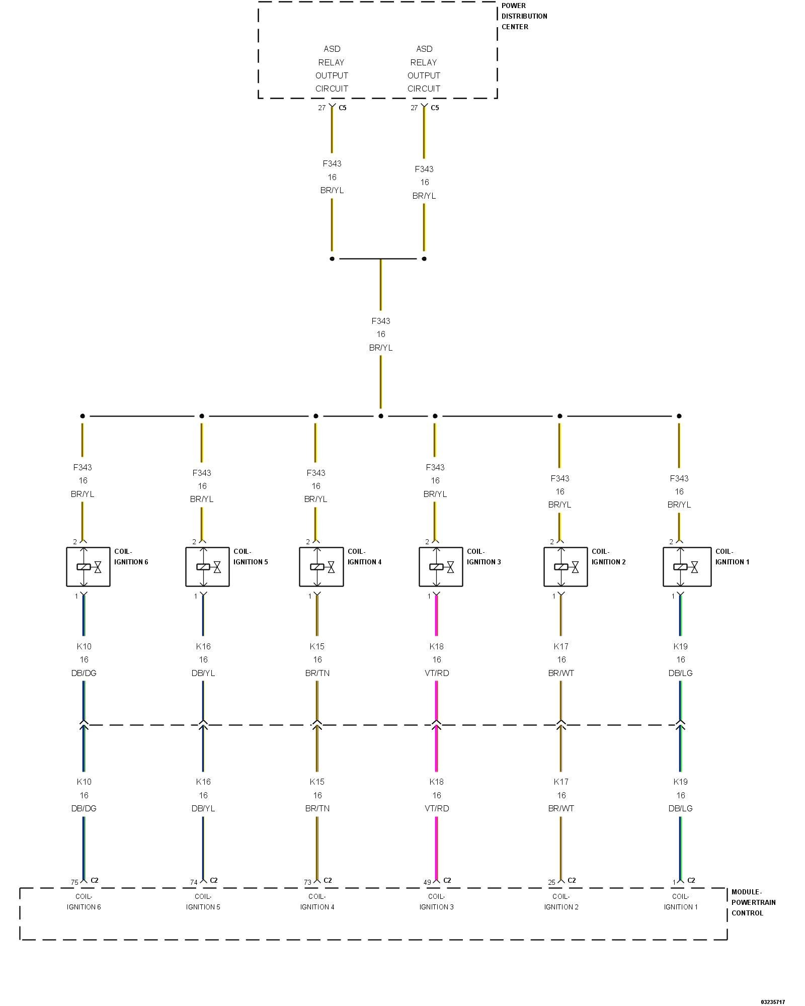 - Repair the open or short to ground in the (F343) ASD Relay Output circuit between the IPM and Coil harness connector.