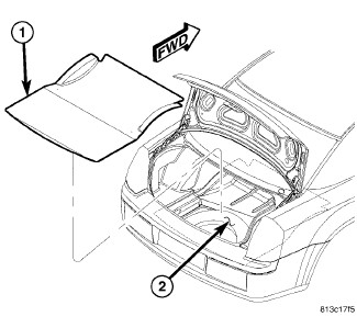 2. Unfold, position and fit the spare tire cover/trunk floor carpet over the spare tire well (2) in the luggage compartment.