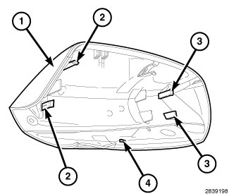 2. Review the snap locations (1 & 2) on the mirror assembly (3).