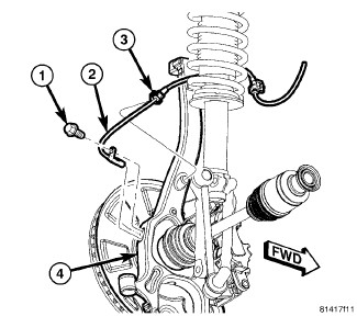 1. Install wheel speed sensor (2) head into knuckle (4) and install mounting screw (1). Tighten screw to 11 Nm (97 in. lbs.).