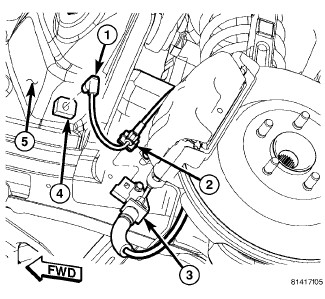 2. Attach wheel speed sensor cable and routing clip (3) to knuckle (4).