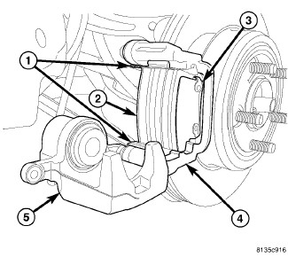 4. Install NEW inboard (2) and outboard (3) brake pads on caliper adapter (4). NEW Inboard and outboard pads are interchangeable.