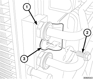 2. Install the radiator mounting bracket (1) and bolts (2). Tighten to 12 Nm (106 in. lbs.).