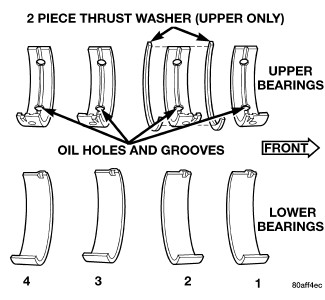 The main bearings are serviced in-vehicle. They must be replaced one-at-a-time in order to properly support the crankshaft. The upper and lower main bearing shells are NOT interchangeable. The upper and lower main bearings are "select fit" to achieve proper oil clearances Procedures.
