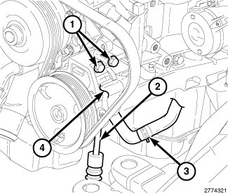 23. If removed, position the power steering pump (4) to the engine block. Install the three pump mounting bolts (1) and tighten to 25 Nm (18 ft. lbs.).
