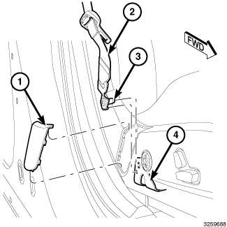 4. Position the belt web guide (4) to the holes in the inner B-pillar and use hand pressure to press it firmly and evenly until the two clips that secure it snap into place. Be certain that the seat belt webbing between the retractor and the web guide is not twisted.